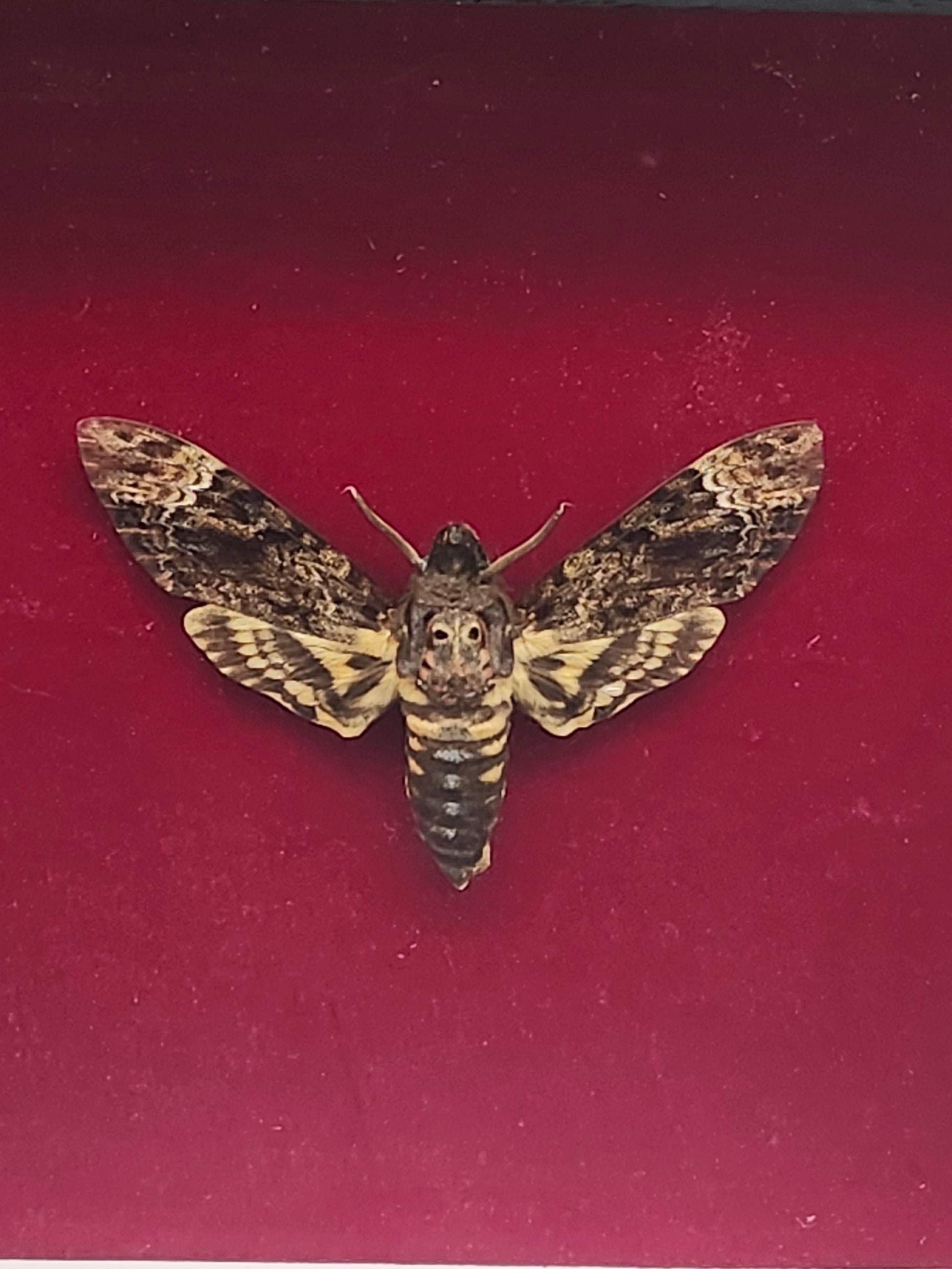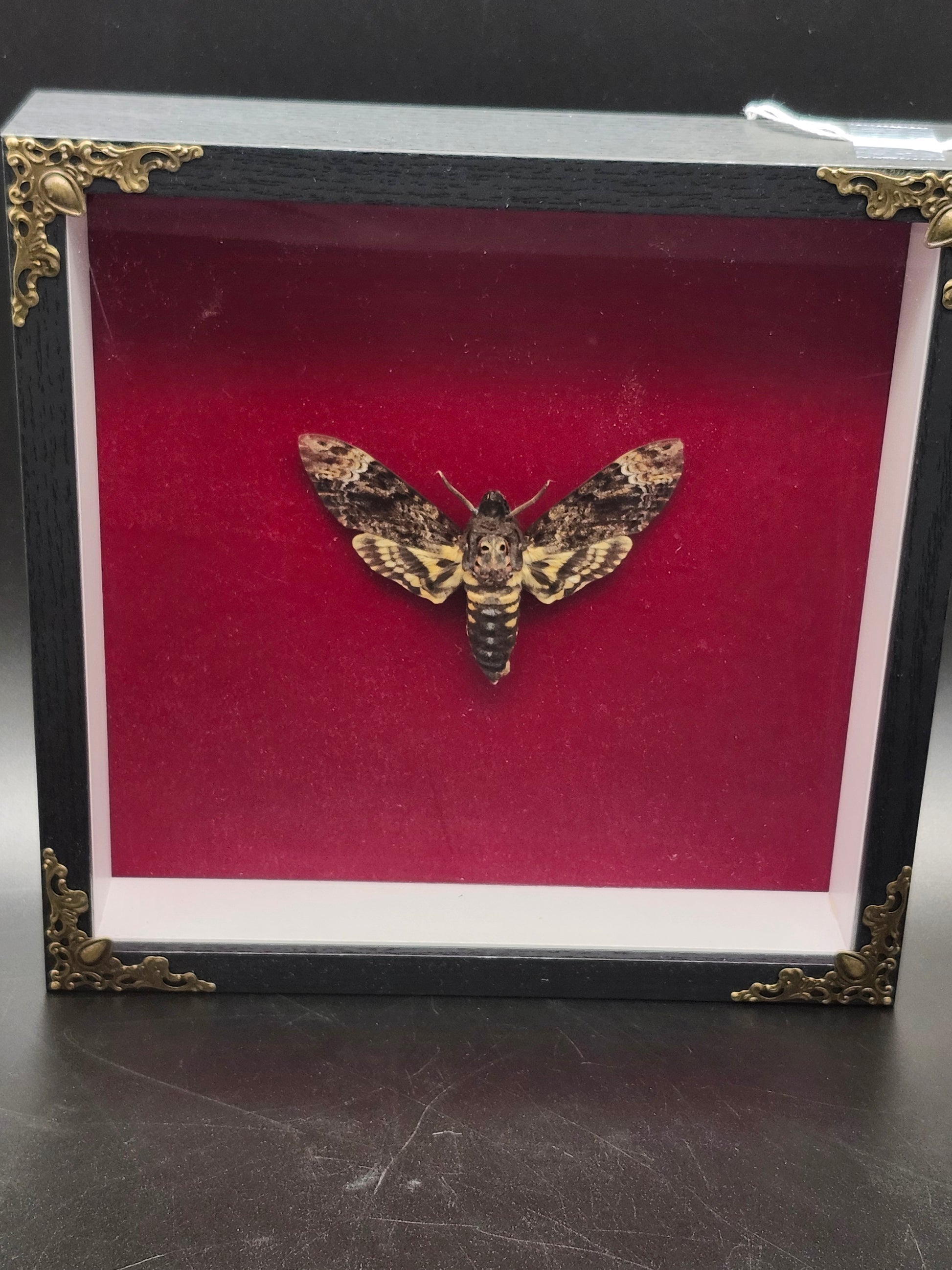 Framed Death Head Moth in shadow box. We frame many every week, so please do not be surprised if you receive a specimen with a different coloured background